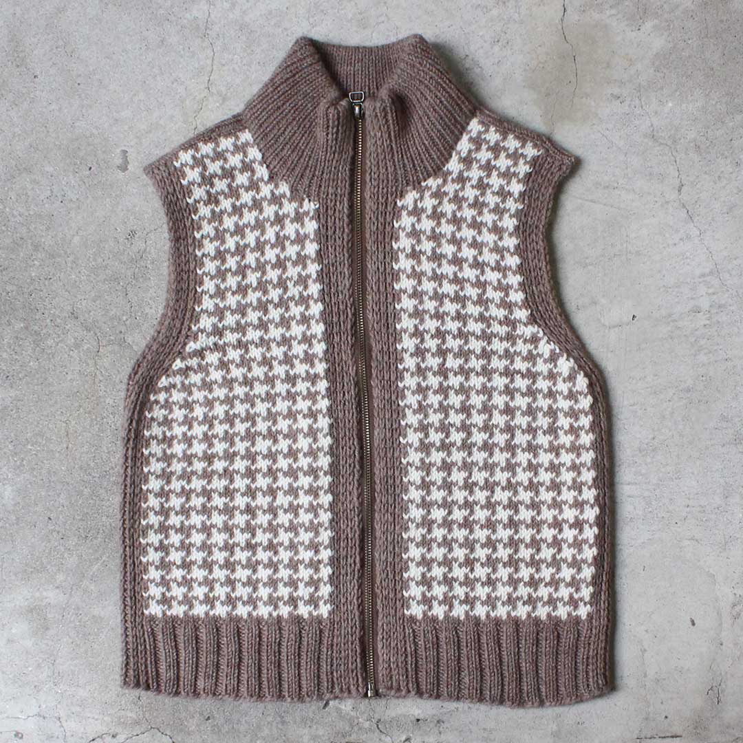 クラシックな幾何学模様を、無地の引き上げゴム編みで囲ったようなデザインのジップアップベストです。