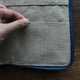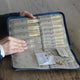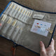 リネンのオリジナルケースは、周囲のファスナーがアクセント。ファスナーを開けるとしっかりと見開きの状態になって、パーツの出し入れもスムースです。ケースの右側にはポケットがあるので、編み物に使う小さなお道具を一緒にしまっておくことができます。