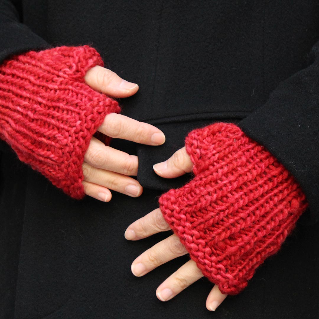やわらかなコリデールの原毛を手紡ぎしたウール糸「クラシカ」でざくざくと編む、フィンガーレスグローブです。