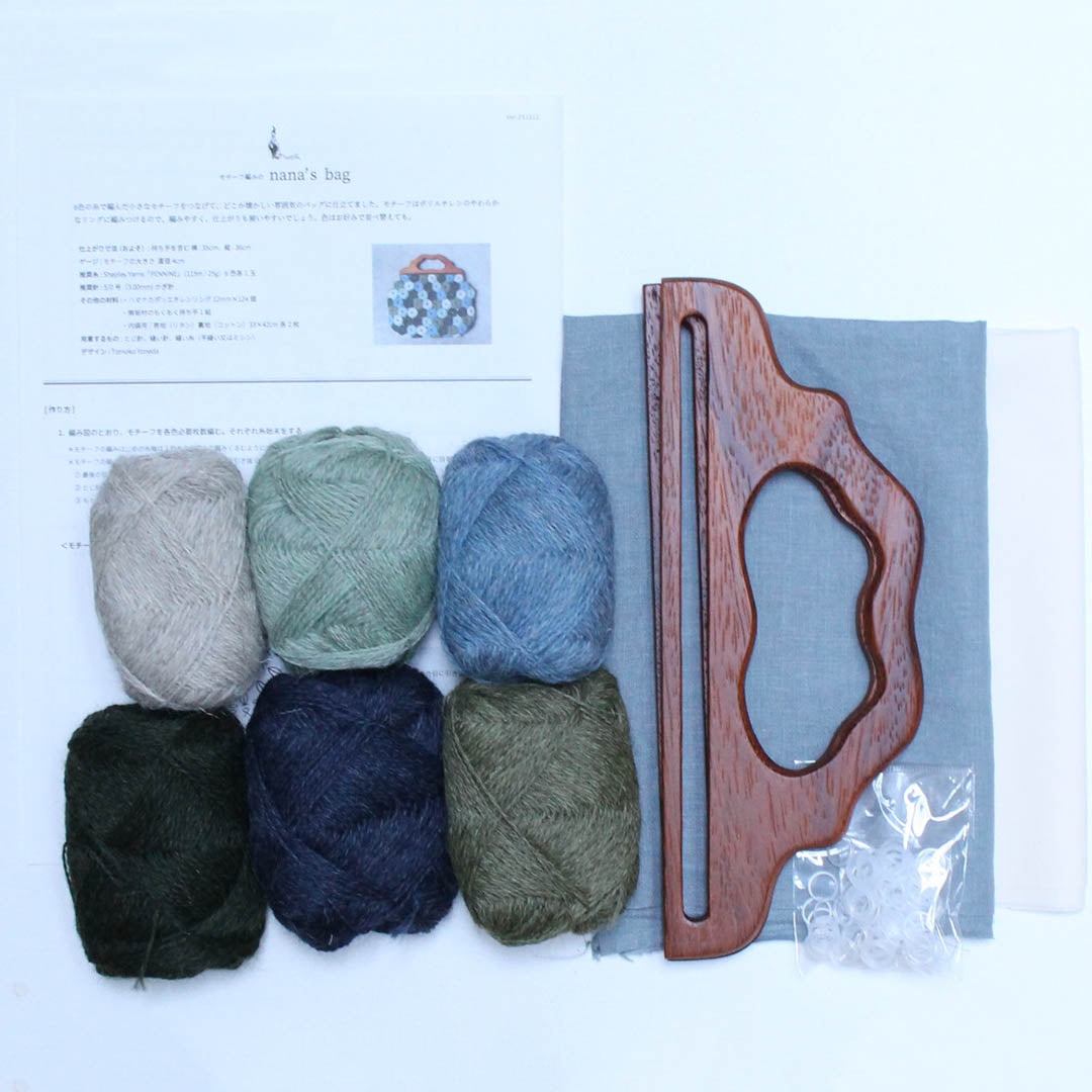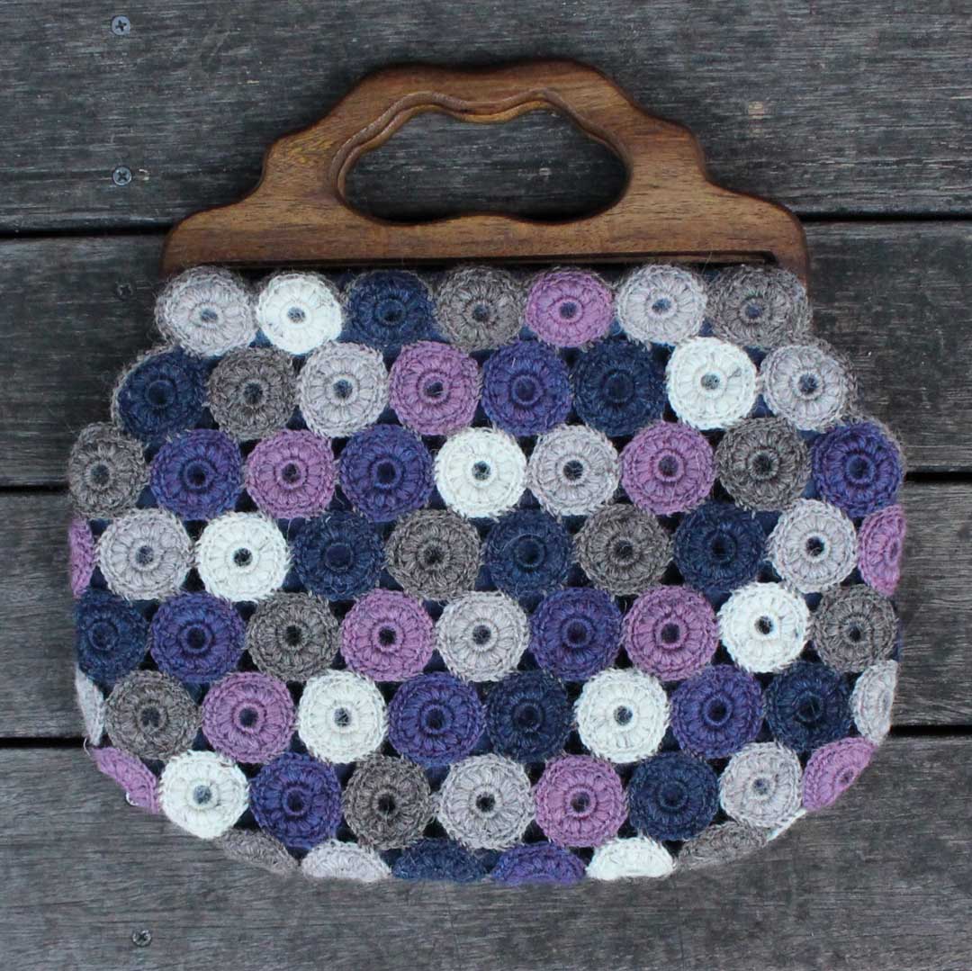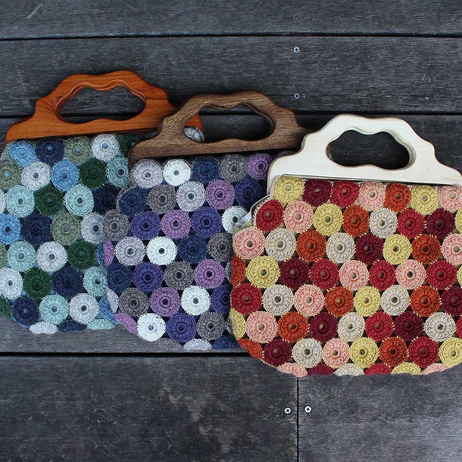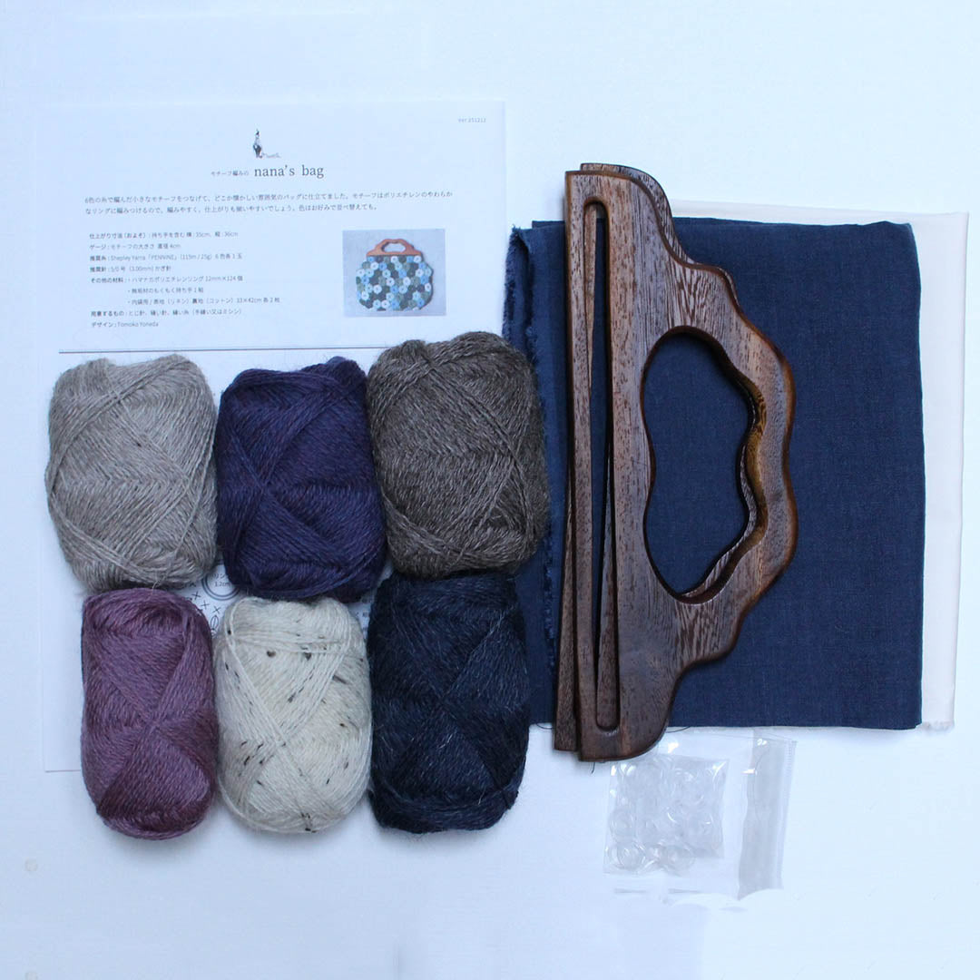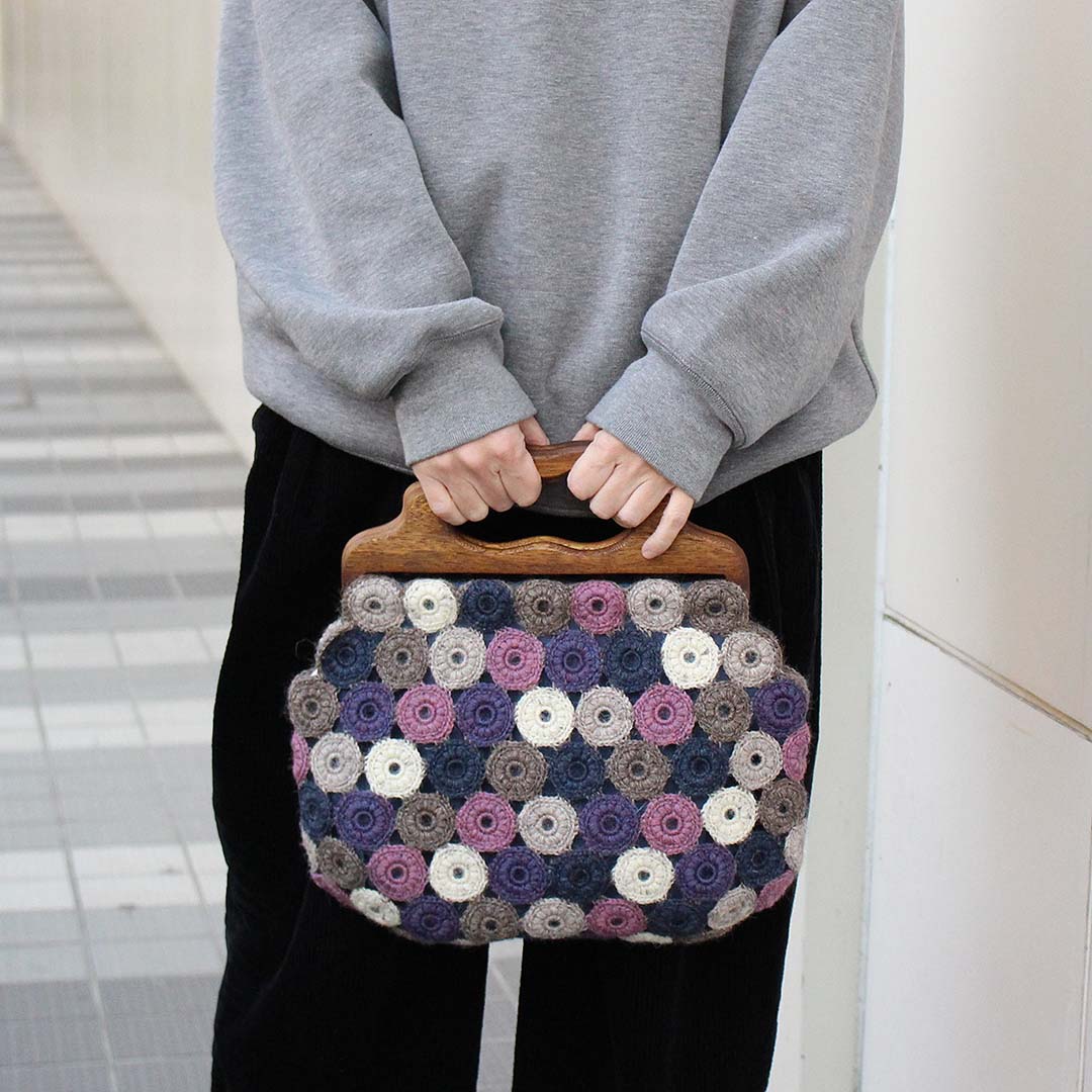 かぎ針編みのモチーフをつなげ、無垢材の持ち手をつけたノスタルジックな雰囲気のバッグをつくるキットです。