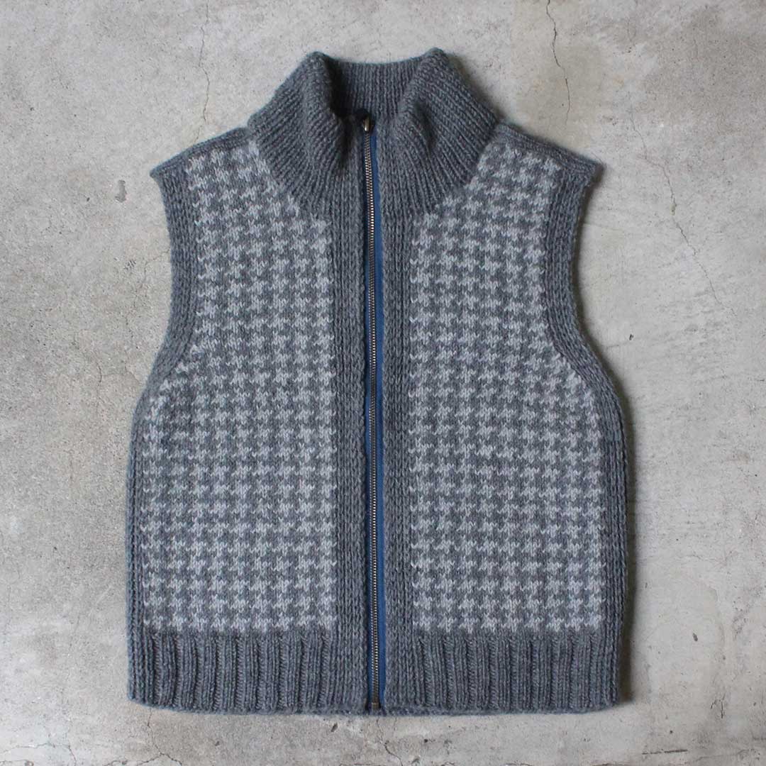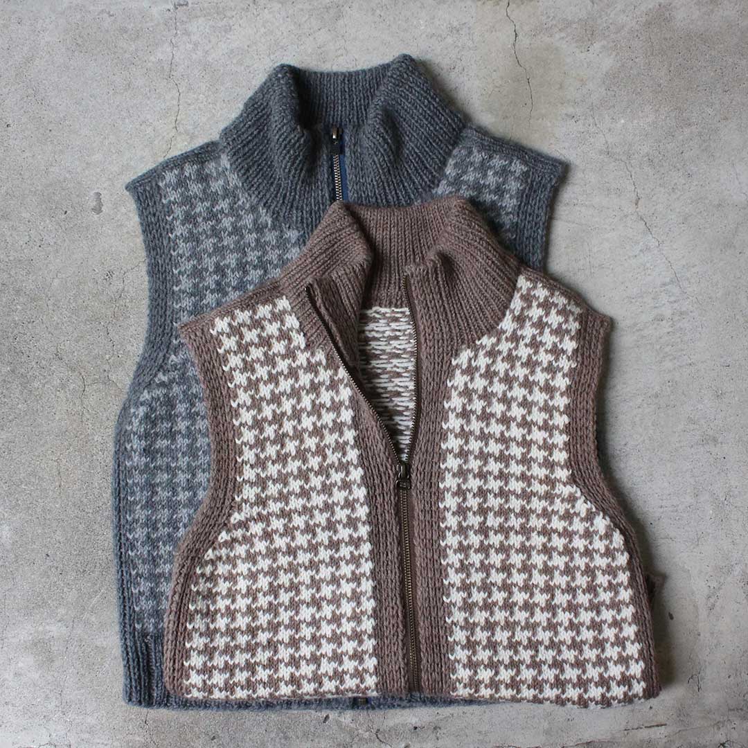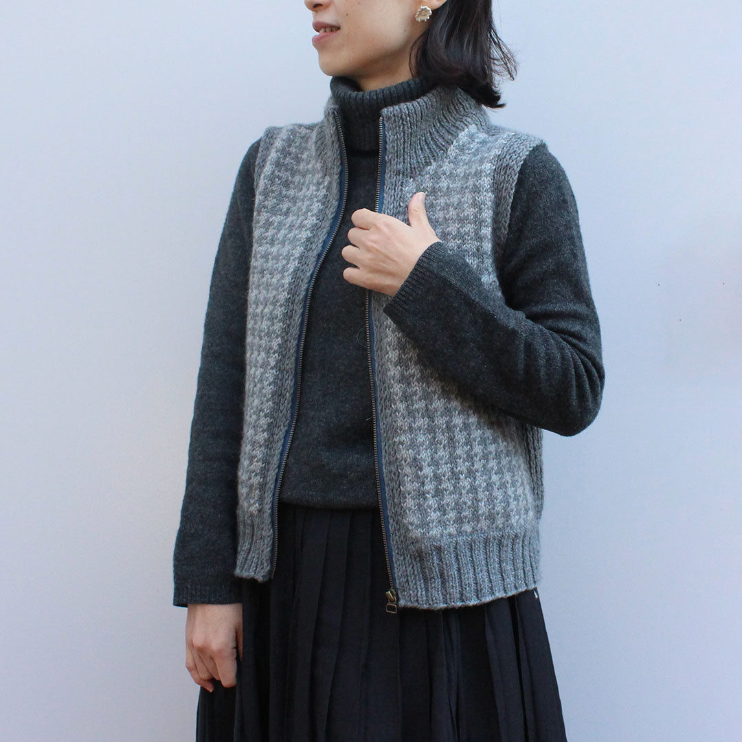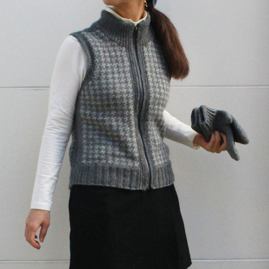 コーディネートしやすい幾何学模様を配した、ニットベストは長い季節重宝するアイテム。